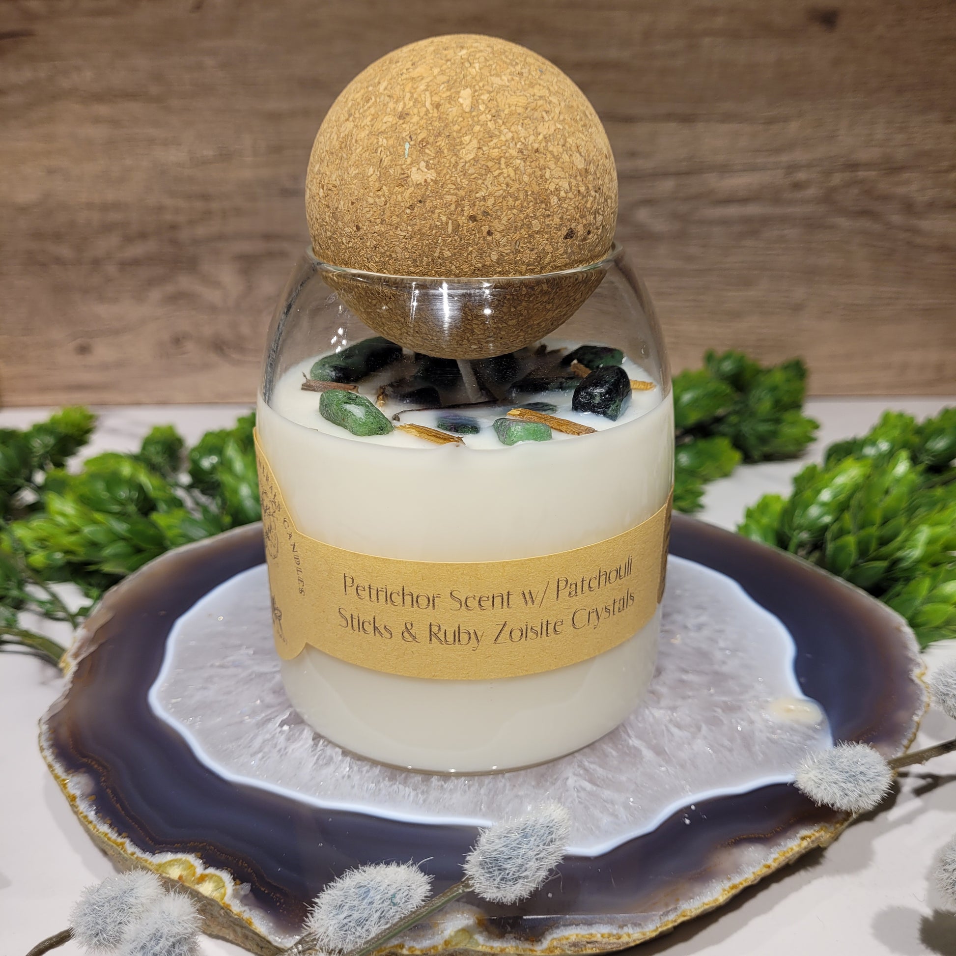 This candle has a lovely Petrichor scent and is decorated with patchouli sticks and Ruby Zoisite crystals top!