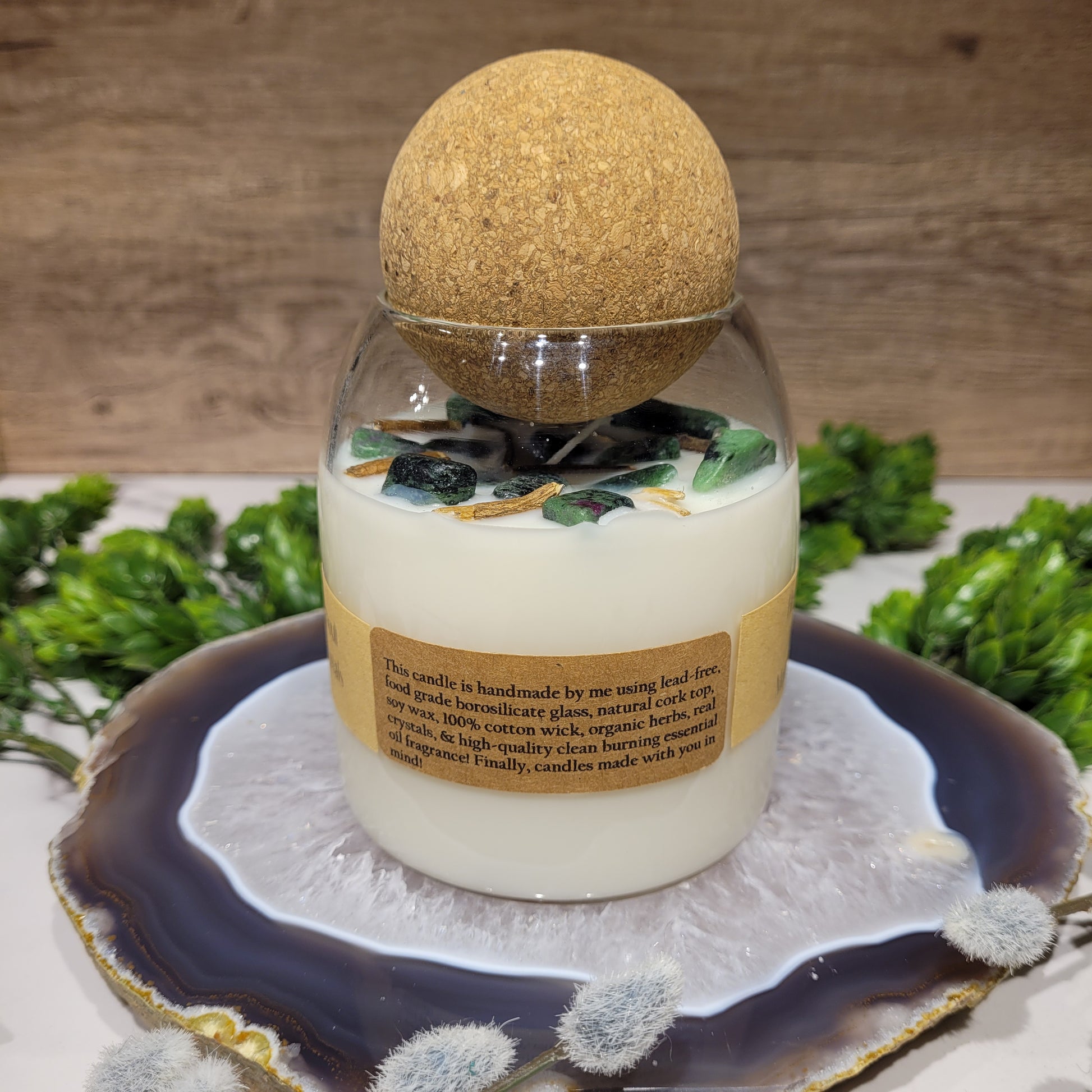 Handmade soy candles created with high-quality clean burning essential oil infused fragrance, 100% cotton wick, lead free borosilicate glass jar, natural cork lid, decorated with organic dried herbs and ethically sourced crystals in a 17 oz jar. Plus there is a hidden crystal on the bottom!