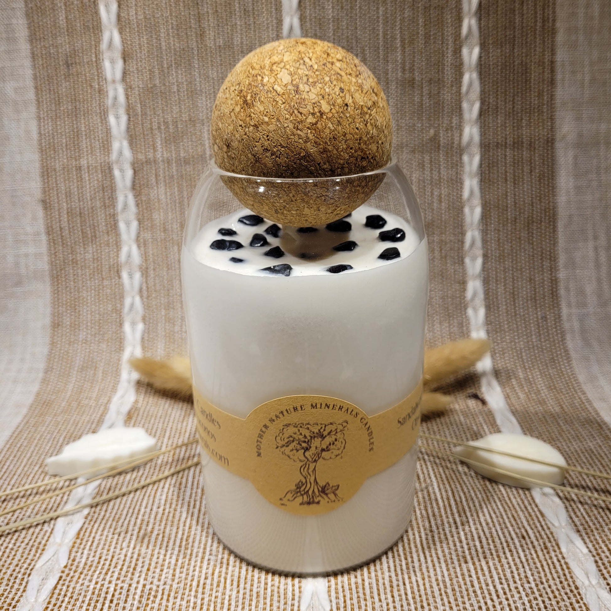 Handmade soy candles created with high-quality clean burning essential oil infused fragrance, 100% cotton wick, lead free borosilicate glass jar, natural cork lid, decorated with organic dried herbs and ethically sourced crystals in a 25 oz jar. Plus there is a hidden crystal on the bottom!