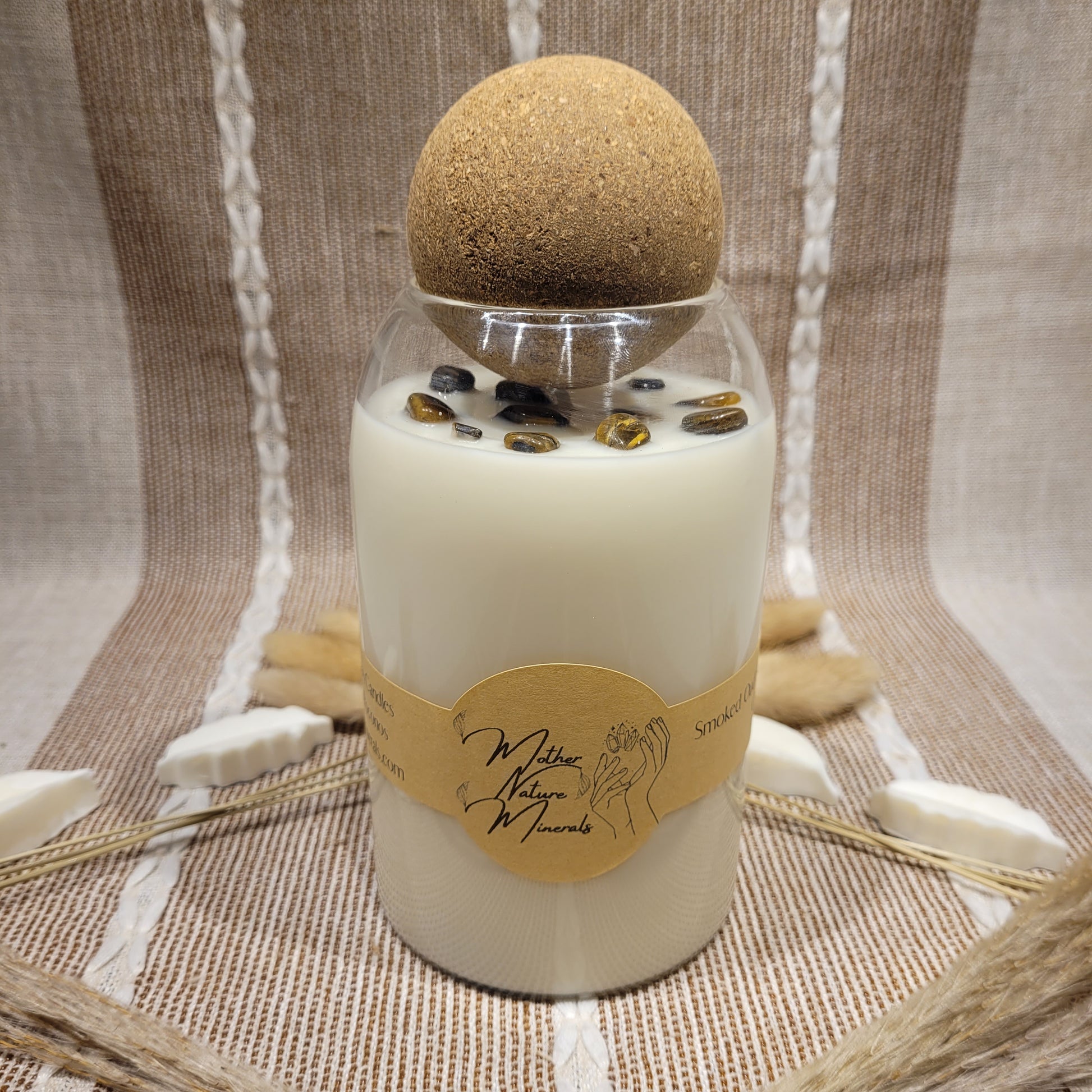 Handmade soy candles created with high-quality clean burning essential oil infused fragrance, 100% cotton wick, lead free borosilicate glass jar, natural cork lid, decorated with organic dried herbs and ethically sourced crystals in a 25 oz jar. Plus there is a hidden crystal on the bottom!