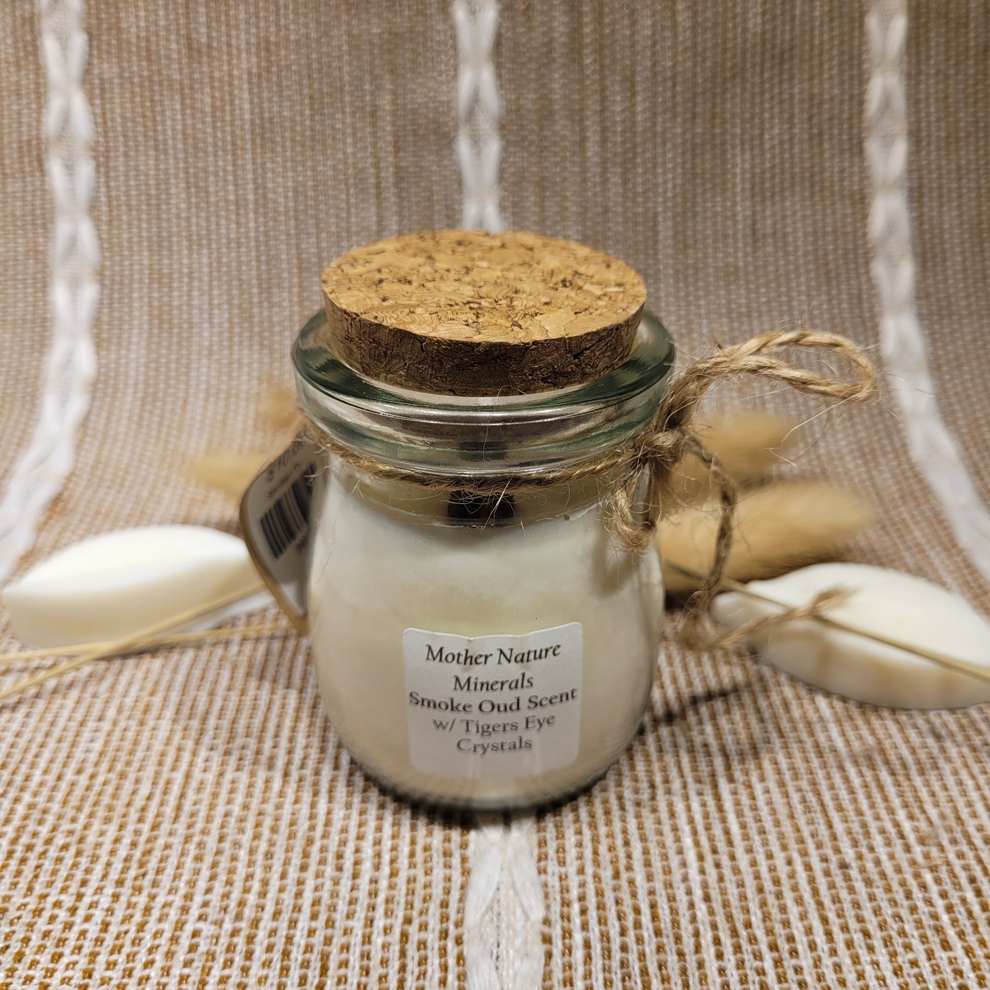 This candle has a lovely Smoked Oud scent and is decorated with Tigers Eye crystal chips on top!