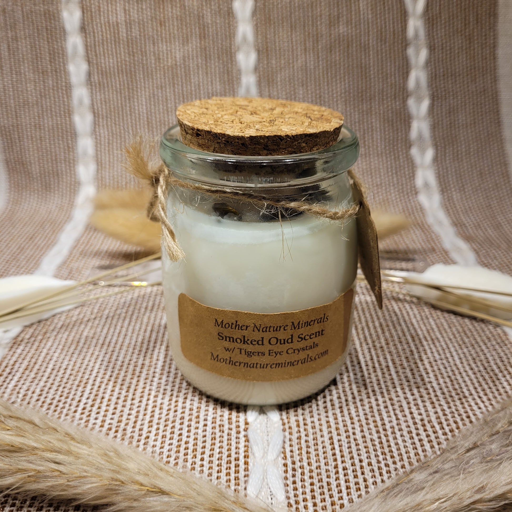 This candle has a lovely Smoked Oud scent and is decorated with Tigers Eye crystal chips on top!