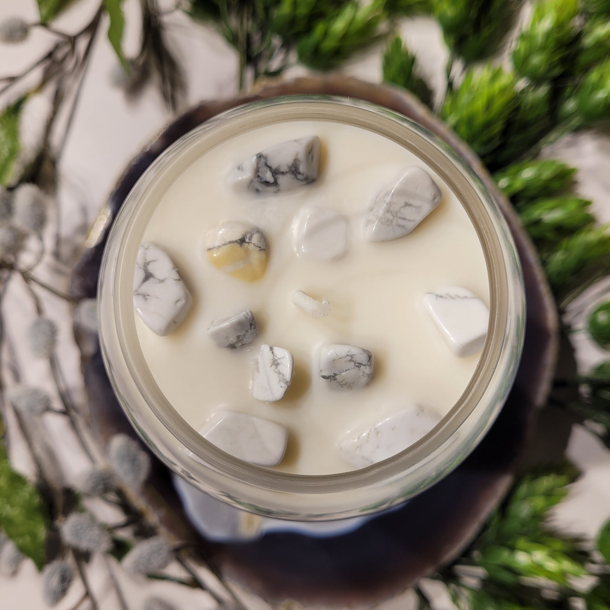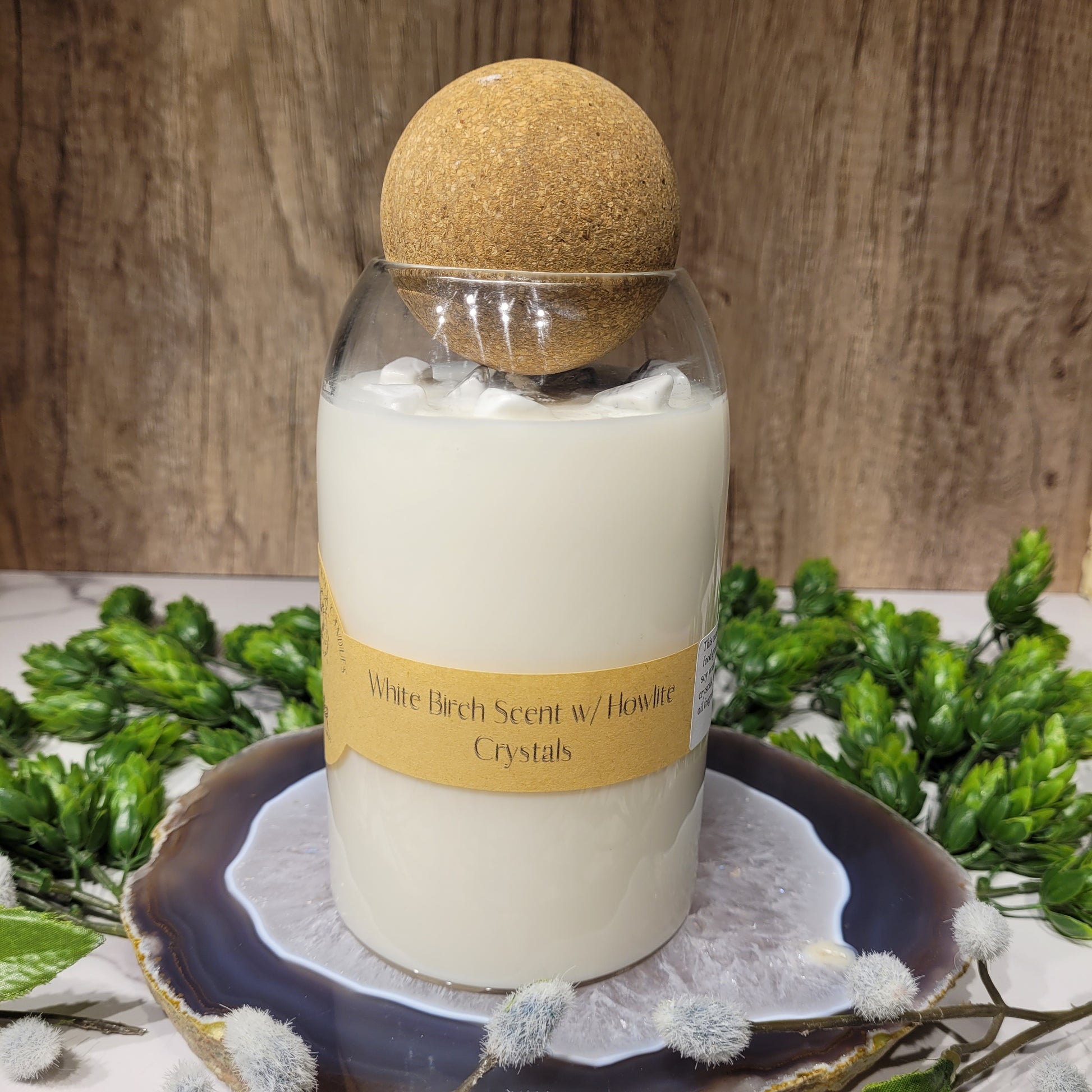 This candle has a lovely White Birch scent and is decorated with Howlite crystal chips on top!