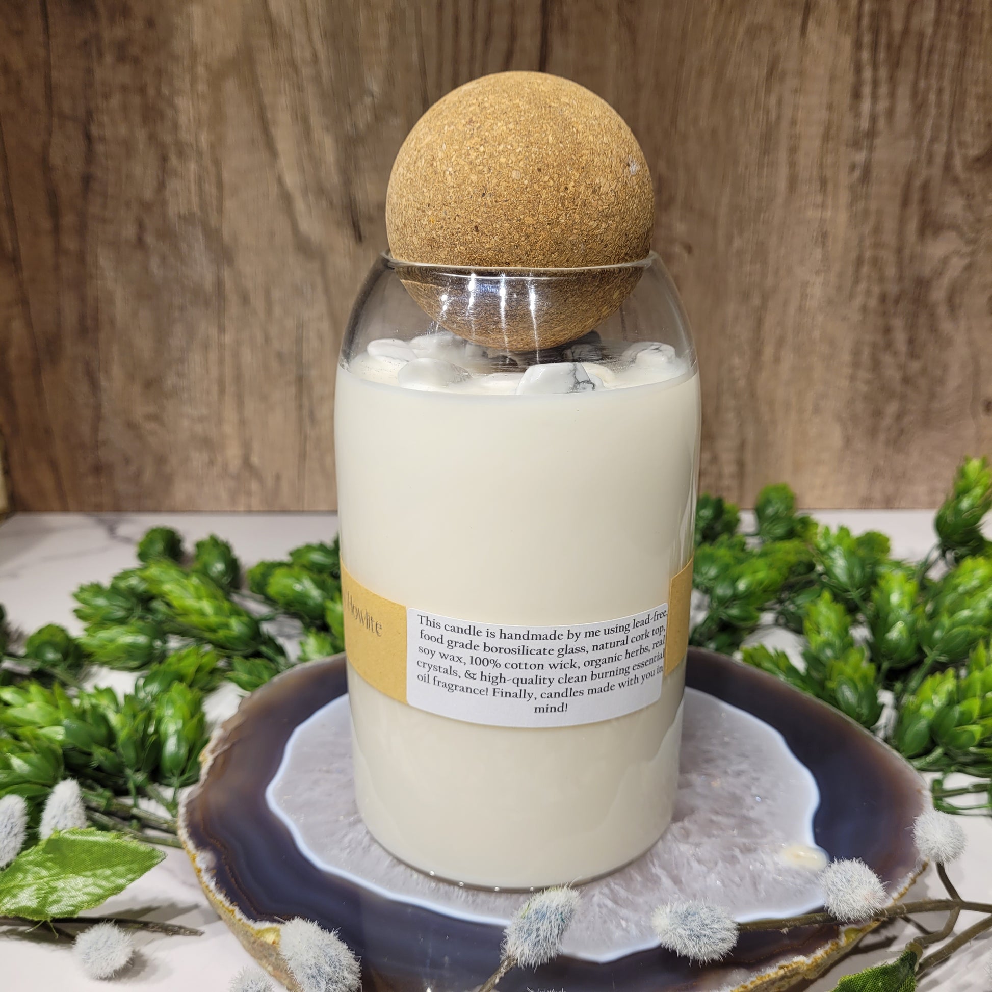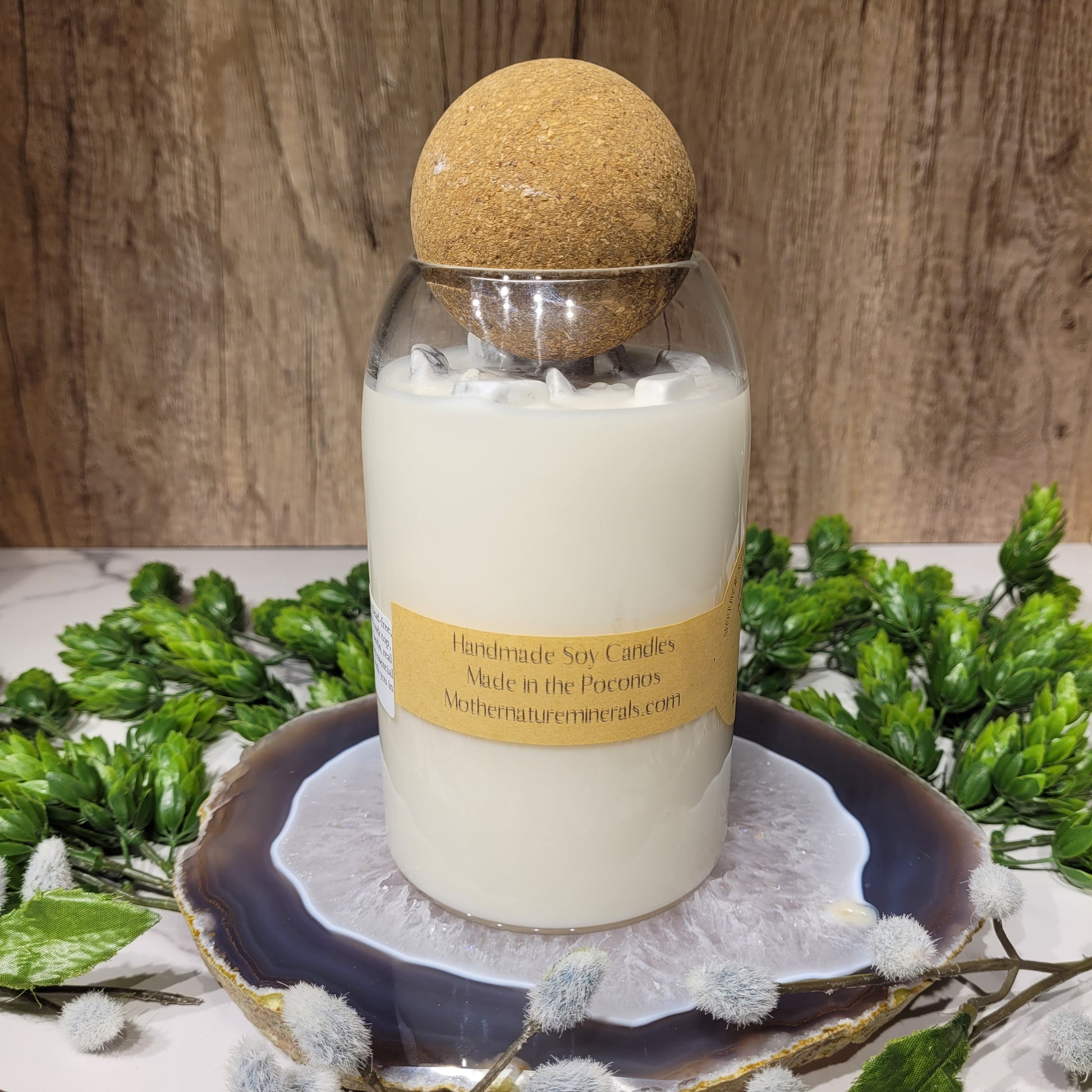 Handmade soy candles created with high-quality clean burning essential oil infused fragrance, 100% cotton wick, lead free borosilicate glass jar, natural cork lid, decorated with organic dried herbs and ethically sourced crystals in a 25 oz jar. Plus there is a hidden crystal on the bottom!